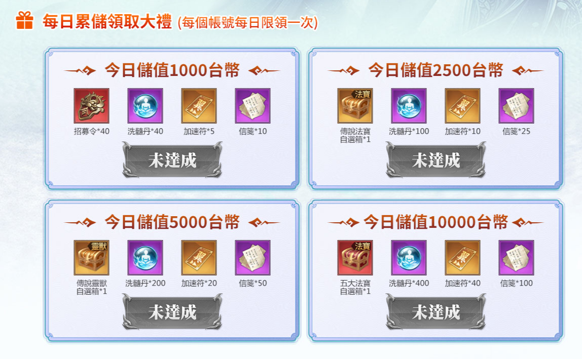 2、“每日累儲”達到活動條件每日僅可领取活動獎勵一次,儲值達到更高檔次,可以領取低檔次的獎勵,如:單日儲值10000台幣,可領取1000、2500、5000、10000台幣檔次的禮包,以此類推。